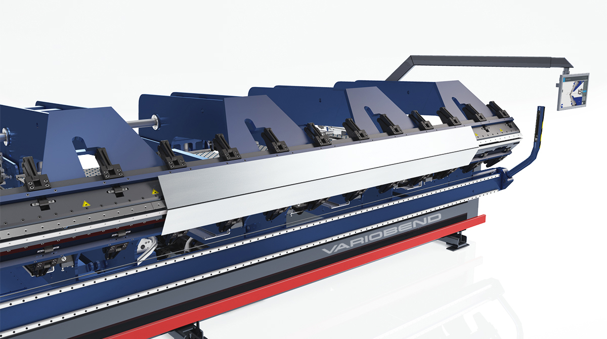 VARIOBEND UP and DOWN Folder of type DB is a high-performance long-length bending machine fitted with two folding beams. VARIOBEND innovations, such as the conical bending and slotting of profiles, the large opening height of the clamping beam, the segmented bending and clamping beams made of high-strength steel as well as the patented bending system with its inclined bending beams belong to the basic equipment of DB. The worldwide unique turning device is available for this model series as well.