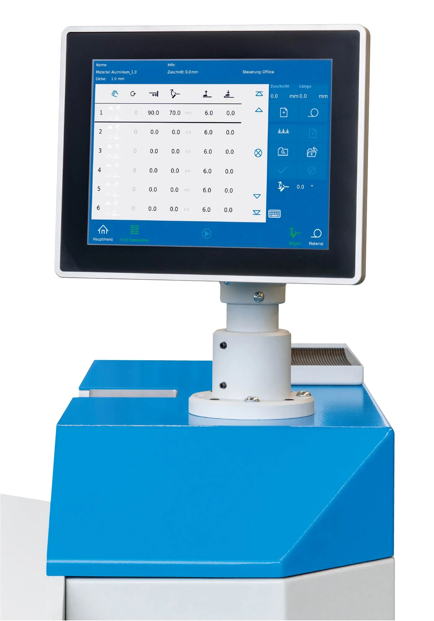 touch-sensitive colour display, intuitive profile creation with profile drawing, sizing, and bending-sequence setting all by fingertip, includes control of all machine function
