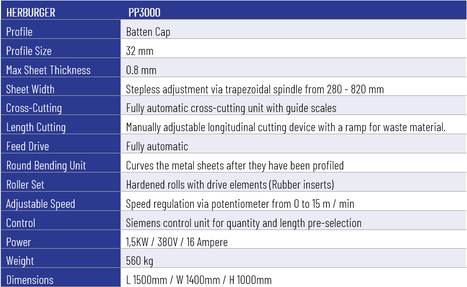 The Herburger Profil Profi PP3000 is more than just a profiling machine — it’s a complete production solution for small or medium-sized roofing and cladding companies.